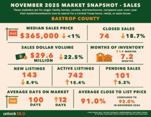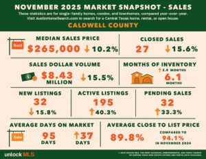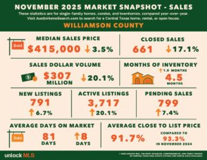 According to the November 2025, pending sales in the Austin-Round Rock-San Marcos MSA rose 4.5% to 2,269 pending sales, and inventory reached 6.3 months, the highest level recorded in over a year. While prices remained stable—dipping 1.1% year over year to $430,000—closed sales fell 15.9% to 1,895 transactions.