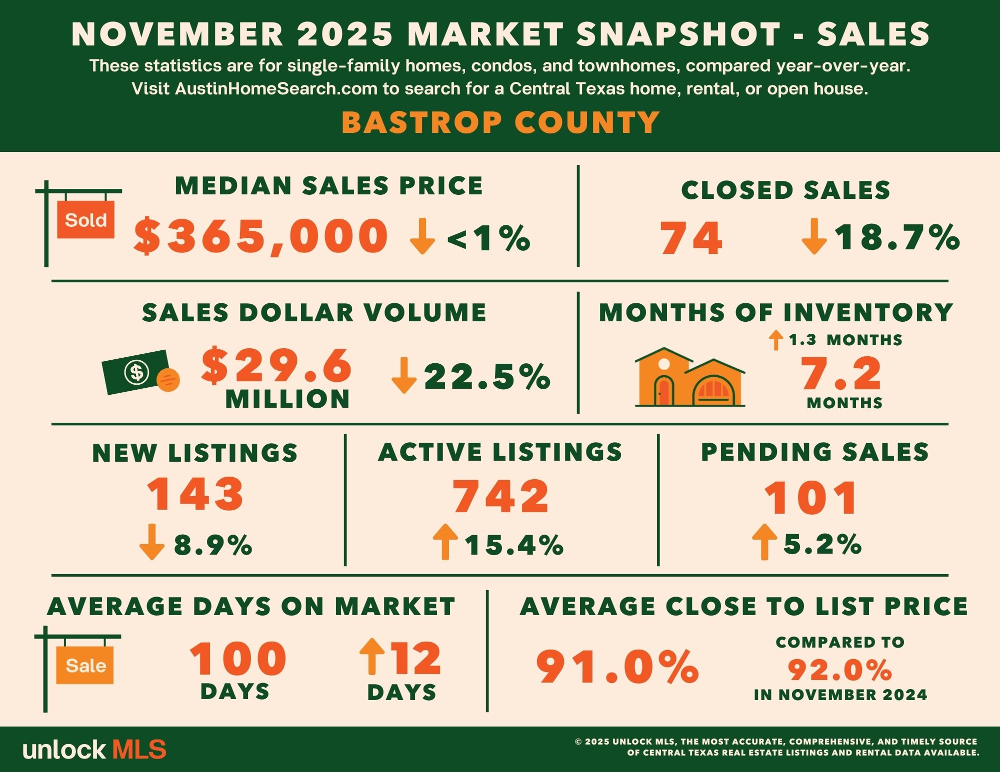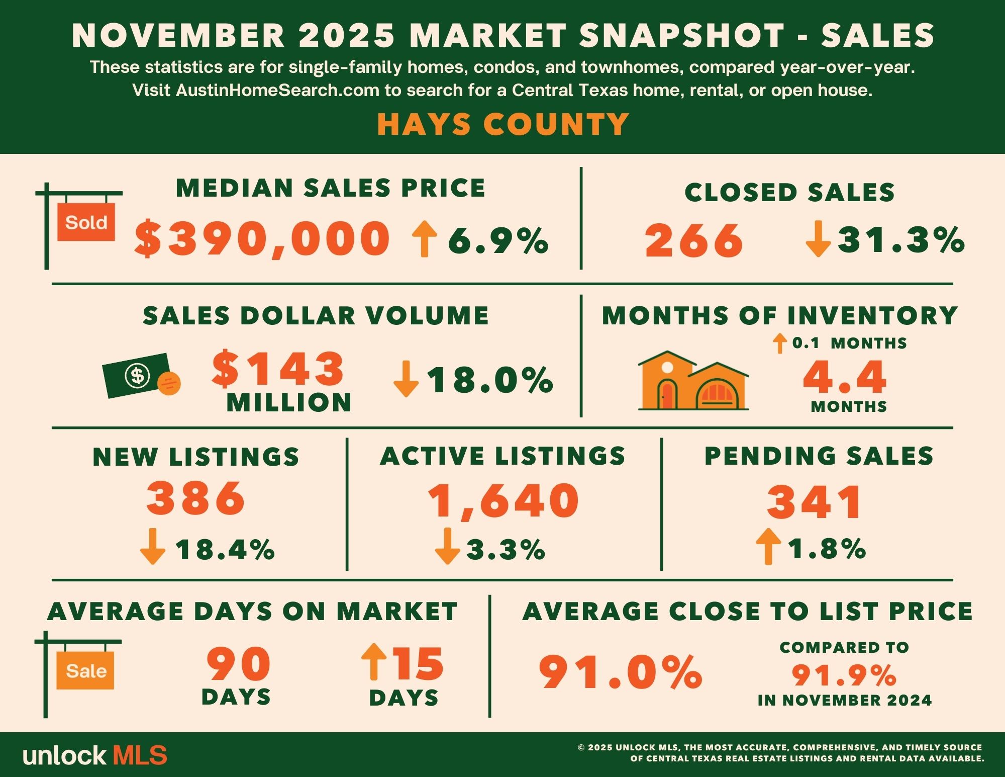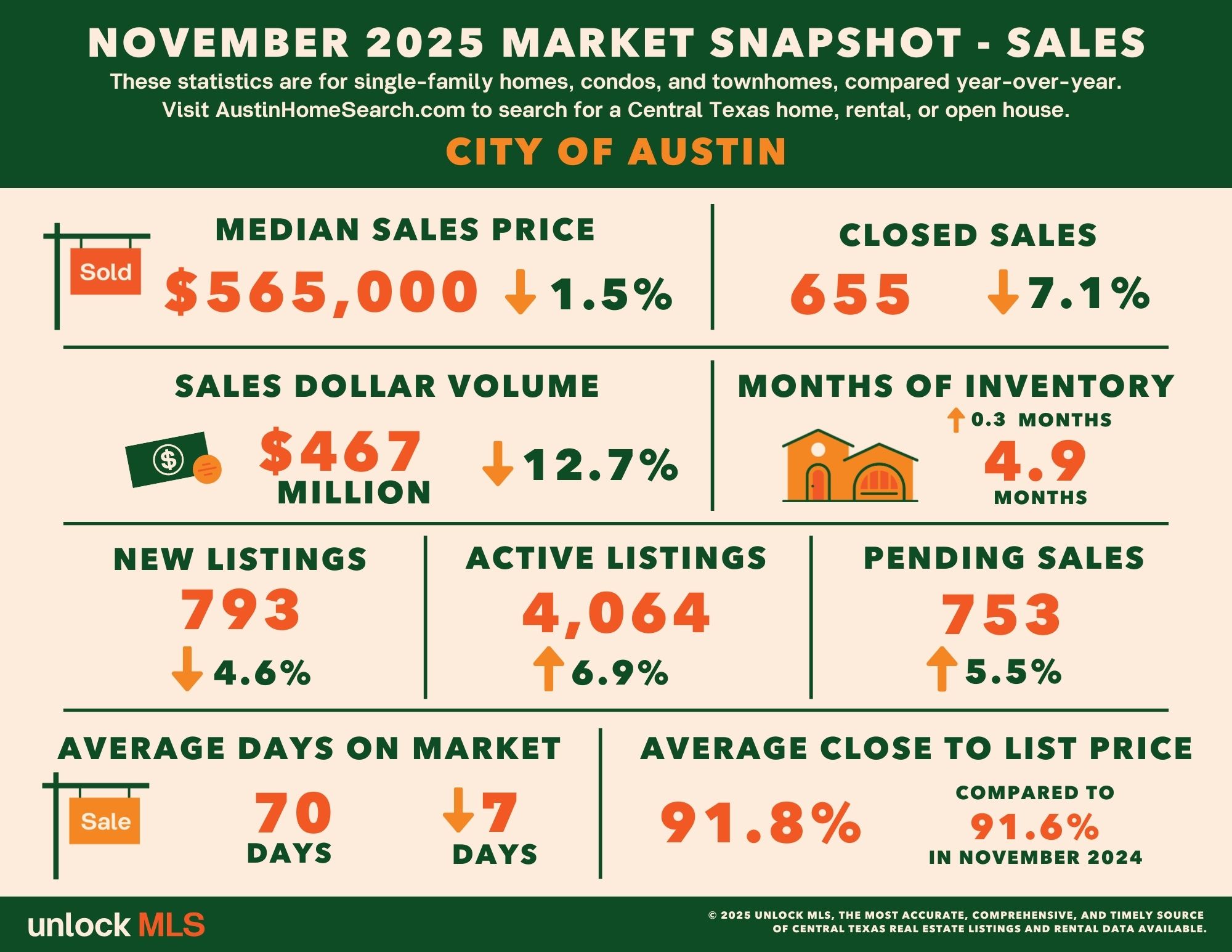 According to the November 2025, pending sales in the Austin-Round Rock-San Marcos MSA rose 4.5% to 2,269 pending sales, and inventory reached 6.3 months, the highest level recorded in over a year. While prices remained stable—dipping 1.1% year over year to $430,000—closed sales fell 15.9% to 1,895 transactions.